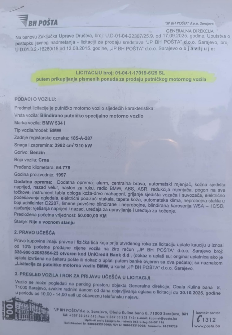 Javno preduzeće BH Pošta objavilo je javni poziv zainteresiranima da kupe posebno vozilo, saznaje Politicki.ba.